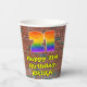 This fun and exciting urban graffiti and street art inspired birthday paper cup design features a large number “21” with a colourful rainbow spectrum gradient inspired pattern, along with the message “Happy 21st Birthday,”, and a customisable name. The background has a brick wall pattern. Vibrant, colourful paper cups like this might be fun to use at a birthday celebration/party being held to honour somebody’s twenty first birthday. [~Z0000543]