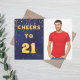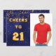 A trendy 21st birthday party invitation. With the text: Cheers to 21 on front written with faux gold balloon letters. Dark blue background, the blue colour is uneven. With golden confetti. Template for your photo.