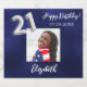 A navy blue background. The blue colour is uneven. Personalise and add a date, name and a photo. Age number written with a faux silver balloon style font.
