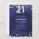 A modern, stylish and glamourous invitation for a 21st birthday party. A navy blue background, decorated with faux silver stars. The blue colour is uneven. Personalise and add your name and party details. Number 21 is written with a balloon style font.