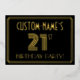 The front of this vintage-look twenty-first birthday party foil invitation features a custom name, a large art deco look inspired number “21ST”, the message “BIRTHDAY PARTY!”, and a border pattern consisting of lines. The front also features a black-coloured background by default, but it can be customised to a different colour if desired. The back features personalised details about the event, such as the date, time, location, and any other information that may be relevant. Elegant, luxurious, editable invitations like these might be used to invite guests to a birthday party/celebration being held in celebration of somebody’s 21st birthday. [~Z0000590]