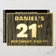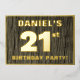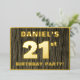 The front of this bold twenty-first birthday party/celebration foil invitation card features a custom name, a large number “21st”, the message “BIRTHDAY PARTY!”, and a border, all in foil. The background of the front features a rustic, yet elegant, faux wood grain appearance inspired pattern. The back features personalised details about the event, such as the date, time, venue, and any other information that may be useful. Customisable invitations like these might be used to invite guests/attendees to a birthday party being held in celebration of somebody’s 21st birthday. [~Z0000598]