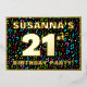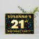 The front of this eye-catching twenty-first birthday celebration foil invitation card design features a custom name, a large number “21st”, the message “BIRTHDAY PARTY!”, and a border. The background of the front has an exciting, colourful pattern of music symbols. The back features personalised details about the event, such as the date, time, location/venue, and any other important information. Customisable invitations like these might be a fun way to invite guests/attendees to a birthday party/gathering being held to celebrate somebody’s 21st birthday. These might be extra special for a music-themed birthday party. [~Z0000601]
