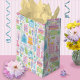 twenty first birthday bright pastel pink, blue, green, purple and orange party cake, presents and balloons. Each present has the number 21 on it to make the birthday girl feel special. Butterflies, flowers, xo's, and hearts are added throughout the pattern. Pretty girly gift bag for a 21st birthday celebration.
