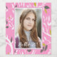 An elegant and modern botanical pattern of branches and leaves in girly pink, green and white as background. A slim white frame and template for Your photo. White text overlay: Hello 21! A label for a 21st birthday party.