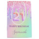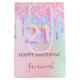 Elegant, classic, glamourous and feminine for a 21st birthday party. A rainbow, unicorn holographc background in pink, purple, rose gold and mint green. Decorated with faux glitter drips, paint dripping look. Personalise and add a name. With the text: Happy Birthday. The name is written with a modern hand lettered style script. Number 21 is written with a balloon style font.
