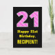 This fun and joyful birthday-themed greeting card design features a large number "21" having a dark pink and light pink stripes pattern containing heart shapes on the front. The front also features the birthday greeting message "Happy 21st Birthday,", and a customizable recipient name. The inside features a personalized birthday greeting message, or could perhaps be cleared and left blank if a message is to be written by hand instead. A customizable birthday card like this might be a fun way to send birthday wishes to somebody who is celebrating their twenty first birthday. It might also be a fun choice for somebody who has a birthday that falls on February 14 (Valentine's Day), due to its loving heart symbols and colors. [~Z0000434]