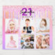 A bottle label for a 21st birthday party, celebrating her life with a collage of 6 of your photos. Personalise and add a name, age 21 and a date. Date of birth or the date of the party. Purple and dark grey coloured letters. A girly, trendy rainbow coloured background in purple, pink and rose gold. Decorated with purple, pink and rose gold faux glitter drips, paint dripping look. The text: Legal and Cheers written over the photos as watermarks.