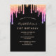 A girly and feminine 21st birthday party invitation. On front: A chic black background. Decorated with faux glitter drips, paint dripping look in purple, pink and faux gold and rose gold. Personalise and add a name and party details. The name is written with a hand lettered style script, light rose gold coloured letters.