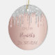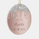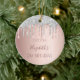 An ornament for a girly and glamourous 21st birthday. A faux rose gold background with an elegant rose gold faux silver glitter drips, paint dripping look. Personalise and add a name, date and age 21. The name is written in dark rose gold with a modern hand lettered style script. Perfect as party decoration, favour, keepsake or as a gift.
