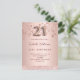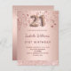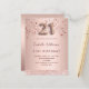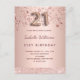 A modern, stylish and glamourous invitation for a 21st birthday party. A faux rose gold metallic looking background with rose gold and pink dripping stars. The name is written with a modern dark rose gold coloured hand lettered style script. Personalise and add your party details. Number 21 is written with a balloon style font, script.
