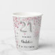 For a glamourous and girly for a 21st birthday party. A faux silver looking background. On the front and the back: Personalise and add a name, and a date. Decorated with pink and faux silver glitter dust. Number 21 is written with a balloon style font.
