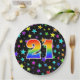 This fun, colourful, and cheerful paper plate design features a large number "21" having a rainbow spectrum gradient inspired pattern colouring. The background features a colourful star shapes pattern. Fun paper plates like this might be used at a party being held to celebrate somebody’s twenty first birthday, or a couple’s twenty first anniversary, or some other twenty first event. [~Z0000493]