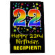 This vibrant, colourful, and fun birthday gift bag design features a large number "22" with a rainbow spectrum gradient style pattern, along with the message "Happy 22nd Birthday,", and an editable recipient name. It also has a background pattern featuring star shapes of various sizes and colours. A fun gift bag like this might be used when wrapping presents being given to somebody in celebration of their twenty second birthday. [~Z0000510]