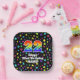 This vibrant and fun birthday themed paper plate design features a large number “22” with a rainbow spectrum gradient inspired pattern, along with the message “Happy 22nd Birthday,”, and a customisable name. The background features a colourful pattern featuring many star shapes with different colours and sizes. Cheerful birthday themed paper plates like this might be used at a party celebrating somebody’s twenty second birthday. [~Z0000582]