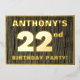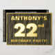 The front of this bold twenty-second birthday celebration foil invitation card features a customisable name, a large number “22nd”, the message “BIRTHDAY PARTY!”, and a border, all in foil. There is a rustic, yet sophisticated, faux wood grain look inspired pattern for the background of the front. The back features personalised details about the event, such as the date, time, location/venue, and any other useful information. Editable invitations like these might be used to invite attendees/guests to a birthday gathering being held in celebration of somebody’s 22nd birthday. [~Z0000598]