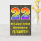 The front of this colorful yet rustic birthday greeting card design features a large number "22" with a rainbow spectrum gradient inspired pattern, along with the message "Happy 22nd Birthday,", and a personalized recipient name. The front features a background depicting a rustic faux wood grain look pattern. The inside features a customized birthday greeting message, or could perhaps be cleared and left blank if a message is to be written by hand instead. A custom birthday card like this might be a fun way to send birthday wishes to somebody who is celebrating their twenty second birthday. [~Z0000419]