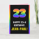 This vibrant and fun birthday-themed greeting card design features a big number “23“ with a multicolor rainbow spectrum inspired gradient pattern, along with the message “HAPPY 23rd BIRTHDAY,”, and a personalised recipient name. The inside features an editable birthday greeting message, or could perhaps be cleared and left blank if a message is to be written by hand instead. An upbeat, customised birthday greeting card like this might be a fun way to deliver some birthday wishes to somebody who is celebrating their twenty-third birthday. [~Z0000636]