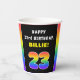 This bold and fun birthday paper cup design features the number “23“ having a multicolored rainbow spectrum inspired gradient pattern, along with the message “HAPPY 23rd BIRTHDAY,”, and a customisable recipient name. Birthday themed paper cups like this might be a fun way to celebrate somebody’s twenty third birthday. [~Z0000639]
