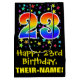 This exciting, vibrant, and fun birthday-themed gift bag design features a large number "23" with a rainbow spectrum gradient inspired pattern, along with the message "Happy 23rd Birthday,", and a customisable recipient name. It also has a background pattern featuring star shapes of various sizes and colours. A gift bag like this might be used when giving a gift or present in honour of somebody’s 23rd birthday. [~Z0000510]