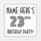 This luxurious and 1920s/1930s style inspired twenty-third birthday celebration/party square sticker design features a personalised name, an intricate art deco look inspired number “23rd”, the message “BIRTHDAY PARTY!”, and a border pattern consisting of lines. Elegant stickers like these might be used or given out at a party held for somebody in celebration of their twenty third birthday, or perhaps used when wrapping presents or preparing invitations for such an event. [~Z0000618]