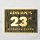The front of this bold twenty-third birthday party/celebration foil invitation card features a custom name, a large number “23rd”, the message “BIRTHDAY PARTY!”, and a border, all in foil. There is a rustic, yet sophisticated, faux wood grain look inspired pattern for the background of the front. The back features personalised details about the event, such as the date, time, venue/location, and any other important information. Editable invitations like these might be used to invite guests to a birthday party/gathering being held in celebration of somebody’s 23rd birthday. [~Z0000598]
