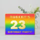 The front of this upbeat and joyful twenty-third birthday celebration/party foil invitation card design features a custom name, a large number “23rd”, the message “BIRTHDAY PARTY!”, and a border. The background of the front features a fun, colourful, rainbow spectrum inspired gradient pattern. The back features personalised details about the event, such as the date, time, place/venue, and any other relevant information. Personalised invitations like these might be a fun way to invite attendees/guests to a birthday party being held to honour somebody’s 23rd birthday. [~Z0000599]