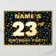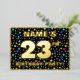 The front of this upbeat and joyful twenty-third birthday party foil invitation card design features a custom name, a large number “23rd”, the message “BIRTHDAY PARTY!”, and a border. The background of the front features a fun, multicolored pattern of star shapes. The back features personalised details about the event, such as the date, time, venue, and any other relevant information. Customisable invitations like these might be a fun way to invite guests/attendees to a birthday party/gathering being held in celebration of somebody’s 23rd birthday. [~Z0000600]
