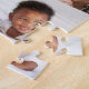 Photo collage puzzle personalised with 24 of your photos in a vertical collage of overlapping photos without any borders.