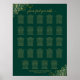 This beautiful wedding seating chart is simple yet elegant. It features a beautiful design of gold text on a lush emerald green background with lacy gold faux foil floral filigree in the corners. It includes table assignments for 240 guests with 10 guests per table.