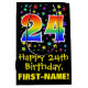 This fun, vibrant, and colourful birthday-themed gift bag design features a large number "24" with a rainbow spectrum gradient style pattern, along with the message "Happy 24th Birthday,", and a custom recipient name. It also has a colourful background pattern featuring star shapes of various sizes. A birthday themed gift bag like this might be used when giving a gift or present in celebration of somebody’s 24th birthday. [~Z0000510]