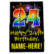 This exciting, fun, and colourful birthday themed gift bag design features a large number "24" with a rainbow spectrum gradient style pattern, along with the message "Happy 24th Birthday,", and a personalised recipient name. It also features a colourful background pattern inspired by bursting celebratory fireworks. A birthday themed gift bag like this might be a fun way to wrap a gift or present being given to somebody who is celebrating their twenty fourth birthday. [~Z0000509]