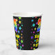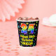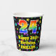 This joyful and colourful birthday themed paper cup design features a large number “24” with a rainbow spectrum gradient inspired pattern, along with the message “Happy 24th Birthday,”, and a personalised name. The background features an exciting and colourful pattern having many star shapes with different sizes and colours. Colourful, vibrant paper cups like this might be fun to have at a birthday celebration/party being held to honour somebody’s 24th birthday. [~Z0000540]