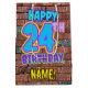 The front of this fun birthday themed gift bag design features the message “HAPPY 24TH BIRTHDAY,” having a vibrant, colourful, urban street art and graffiti inspired appearance, along with a customisable recipient name. The background features a pattern inspired by the look of a brick wall. A colourful gift bag like this might be used when giving a gift or present in honour of somebody’s 24th birthday. [~Z0000536]