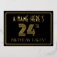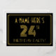 The front of this Roaring Twenties inspired twenty-fourth birthday celebration foil invitation features a personalised name, a large art deco look inspired number “24TH”, the message “BIRTHDAY PARTY!”, and a border pattern consisting of lines. There is a black-coloured background on the front by default, but it can be customised to a different colour if desired. The back features personalised details about the event, such as the date, time, location, and any other information that may be relevant. Luxurious, elegant, customised invitations like these might be used to invite guests to a birthday party being held to celebrate somebody’s 24th birthday. [~Z0000590]