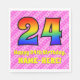 This upbeat and cheerful 24th birthday-themed paper napkin design features a large number "24" having a colourful rainbow spectrum inspired gradient pattern. It also features the message "Happy 24th Birthday,", and a customisable name. The background features a pattern of dark pink and light pink stripes containing loving pink heart shapes. Fun, customisable paper napkins like this might be used at a celebration being held to honour somebody’s twenty fourth birthday. [~Z0000417]