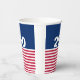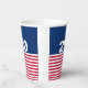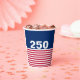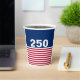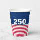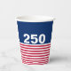 In celebration of America's 250th birthday, this paper cup has a blue field at the top with 250 in white text. It has red and white stripes at the bottom that is reminiscent of the American flag.
