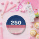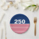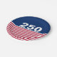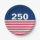 In celebration of America's 250th birthday, this paper plate has a blue field at the top with 250 in white text. It has red and white stripes at the bottom that is reminiscent of the American flag.