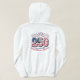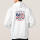 Energetic fireworks burst behind the design, sending out red, white, and blue streaks and starbursts that amplify the excitement and commemorative energy. Clean vector lines and a bright flat white background make this a standout graphic.