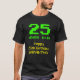 This geeky and silly shirt design has the message "25 YEARS OLD!", the birthday greeting message "Happy 25th Birthday,", and a customisable name. The upper age digits and text feature a geeky, pixelated, green, 8-bit graphics style look inspired by that of retro computer games and retro video games. The lower greeting message features a nerdy, yellow, retro digital computing inspired look. Shirts like this might be worn by the attendees of a birthday party held in celebration of the twenty-fifth birthday of somebody who enjoys retro video gaming or historic computers. [~Z0000455]