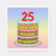 This cheerful and upbeat birthday paper napkin design features a cartoon-style depiction of a three-tier birthday cake having number-shaped candles on top showing the age “25“, along with the message “HAPPY 25TH BIRTHDAY,”, and an editable recipient name. The background features a multi-colour pastel rainbow spectrum inspired gradient pattern. Paper napkins like these might be used at a party held in celebration of somebody’s 25th birthday. [~Z0000623]