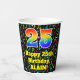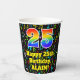 This cheerful and colourful music themed birthday paper cup design features a large number “25” with a rainbow spectrum gradient inspired pattern, along with the message “Happy 25th Birthday,”, and a custom name. The background features a colourful music notes and symbols pattern. Colourful, vibrant paper cups like this might be fun to have at a birthday celebration being held in celebration of somebody’s 25th birthday. [~Z0000541]