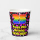 This cheerful and colourful birthday paper cup design features a large number “25” with a rainbow spectrum gradient inspired pattern, along with the message “Happy 25th Birthday,”, and a customisable name. The background features a pattern of heart shapes with colours like red, purple, and pink. Upbeat, friendly paper cups like this might be fun to use at a birthday party being held in celebration of somebody’s twenty fifth birthday. [~Z0000548]