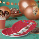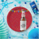 Brown beer bottle with party bunting and colourful confetti on red background for 25th birthday.
