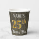 This luxurious and elegant birthday themed paper cup design features a customisable name and the message “25th Birthday Party”. The large number “25th” features a faux/imitation gold-inspired colouring pattern, and the words “Birthday Party” are in ornate script-style text. The background has a faux/imitation woodgrain-inspired appearance. Opulent, fancy paper cups like this might be useful at a birthday celebration/party being held to honour somebody’s 25th birthday. [~Z0000568]