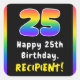 This eye-catching and upbeat birthday square sticker design features the number “25“ having a multicolored rainbow spectrum inspired gradient pattern, along with the message “Happy 25th Birthday,”, and a customisable recipient name. Stickers like these might be distributed or used at a birthday party held in celebration of somebody’s 25th birthday, or perhaps used when preparing invitations or wrapping presents/gifts for such an event. [~Z0000630]