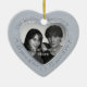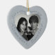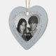 Celebrate 25 years of marriage with a special custom photo ornament in a delightful heart shape frame. Simply upload your own photo of the married couple and it will appear in the cutout. The silver-grey surround features a script font and decorations. (Please note that no actual metallic or shiny ink is used on this ornament, although colours have been chosen to be in keeping with a silver wedding theme.) The words are: 25th Wedding Anniversary - 25 years of love - 25 years of joy. On the back you can personalise this keepsake with your own message for your spouse or the celebrating couple. You can also add the year or a full date if you prefer. Note: if you like the twenty-five year anniversary ornament but have your heart set on a different colour, please contact me.