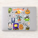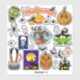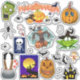 Mixes set of 26 Halloween stickers. Spiders, Bats, Pumpkins, Skeletons, witch legs upside down in a cauldron with apples to the side, a witch frog, miniature spider webs, small scarecrow, scarecrow scene, zombie head, small blood splatter, small haunted house, a small night scene with jack o lanterns lit and bats flying in front of a huge full yellow moon and some houses in the background, and a Halloween design sticker. Zoom in to see the outlined areas of each individual sticker. The top middle Halloween set is ONE sticker with many elements. The bats on the rest of the sheet are individual, and the spiders are individual except for the one hanging down from the Halloween word. A lot of designs to have fun with!