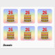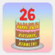 This cheerful and colourful birthday themed square sticker design features a cartoon-style depiction of a three-tier birthday cake having number-shaped candles on top showing the age “26“, along with the message “HAPPY 26TH BIRTHDAY,”, and a customisable recipient name. The background features a multi-colour pastel rainbow spectrum inspired gradient pattern. Upbeat birthday themed stickers like these might be given out or used at a party celebrating somebody’s twenty sixth birthday, or perhaps used when wrapping presents or preparing invitations for such an event. [~Z0000624]