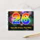 The front of this exciting, fun, and colourful birthday themed postcard design features a large number "26" having a rainbow spectrum gradient inspired pattern. It also features the message "Happy 26th Birthday,", and a customisable recipient name. The front additionally has a colourful and vibrant background pattern inspired by the appearance of bursting celebratory fireworks. The back features an editable birthday greeting message, or could perhaps be cleared and left blank if a message is to be written by hand instead. A customisable birthday postcard like this might be a fun way to send a message in celebration of somebody’s twenty sixth birthday. Postcards like this might also be used to invite guests to a birthday party being held for somebody who is turning 26 years old. [~Z0000446]